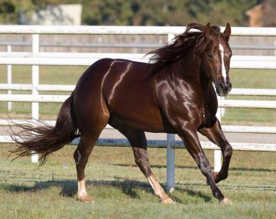 | Conformation | Beautiful deep chestnut with long elegant mane and full tail. Star, strip, snip and two hind socks. Correct and balanced. Long neck and a big hip. Stands 14.2 hands. |